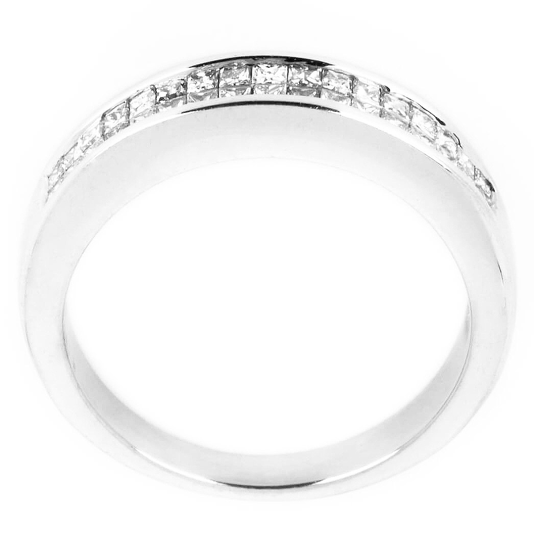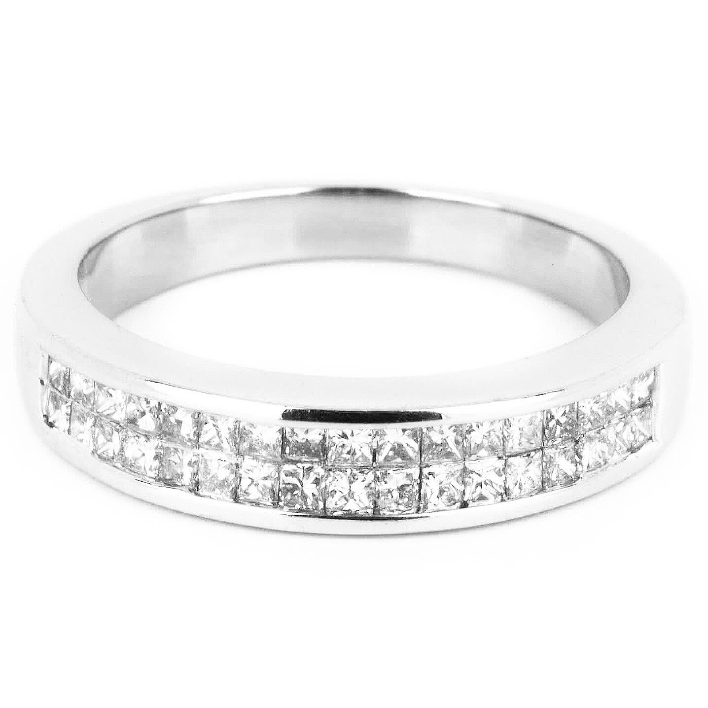 Espléndida alianza de matrimonio para dama, con 32 diamantes princess montados a canal (0.50 ct total). Disponible en oro blanco 14K.