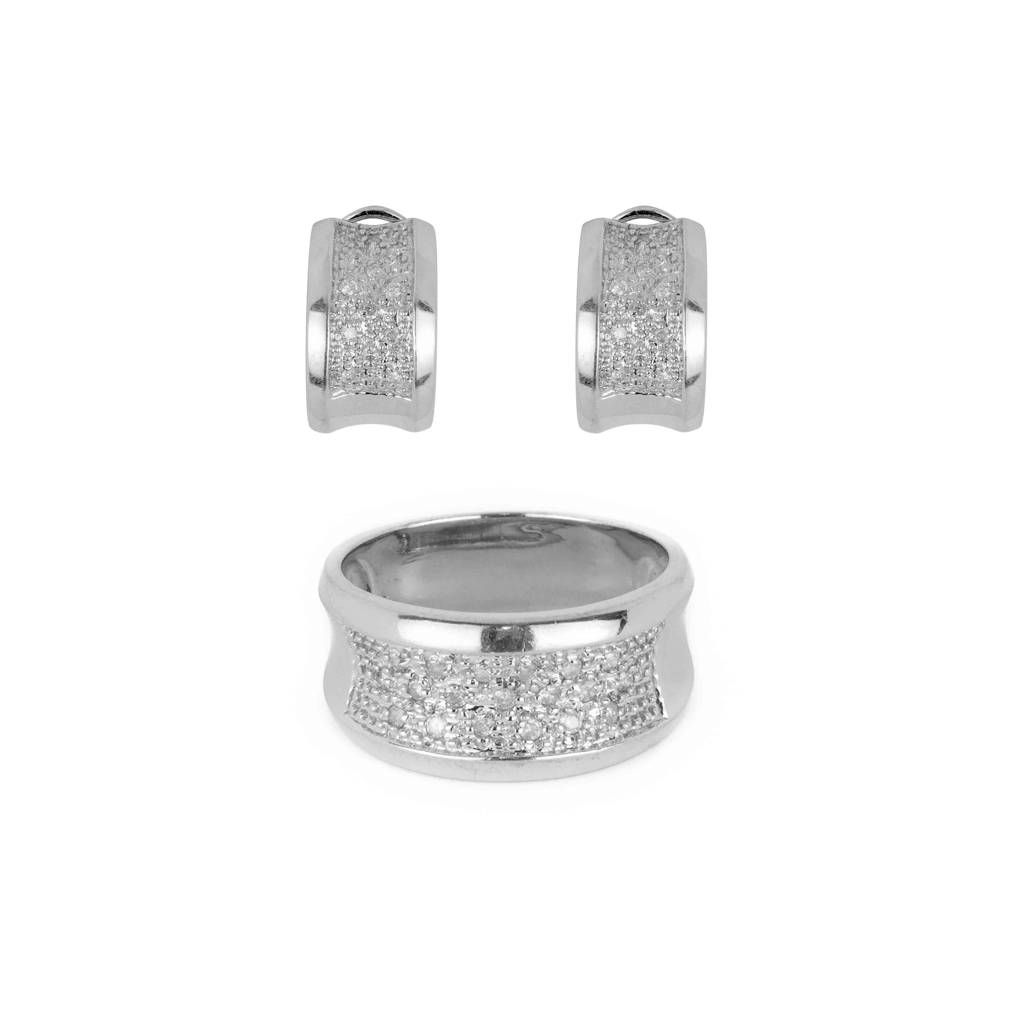 Juego de joyería fina fabricado en oro blanco 14K. Cluster de diamantes con suma total de 0.60 ct. Pieza única.