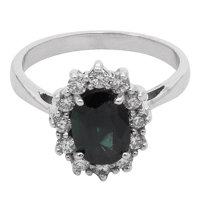 Anillo estilo halo floral, inspirado en la realeza de Inglaterra, con zafiro tonalidad verde oscuro de 2 CT. Anillo listo para entrega.