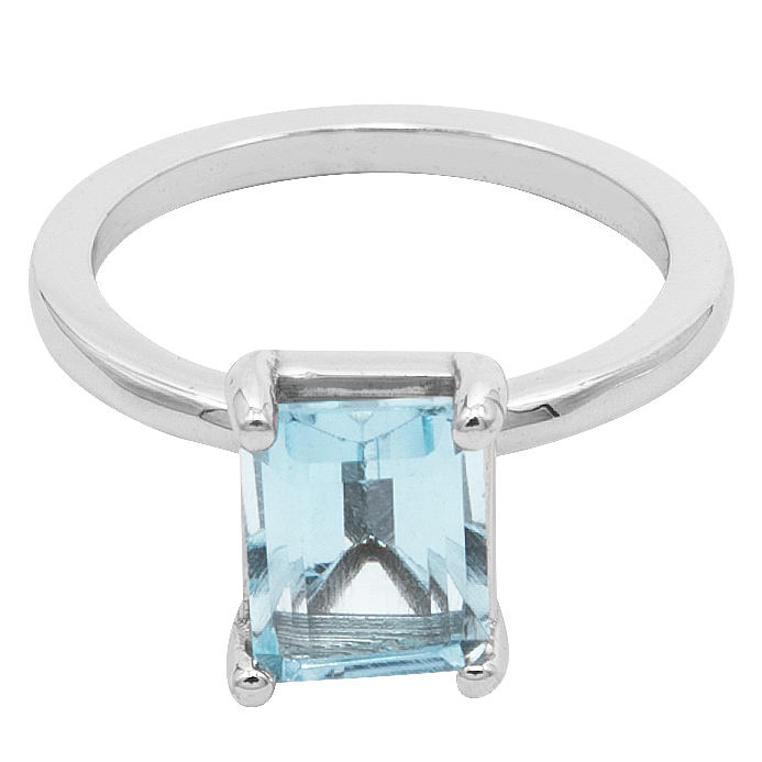 Hermoso anillo clásico en oro blanco 14K, con topacio azul forma esmeralda de 2 CT. Disponible listo para entrega.