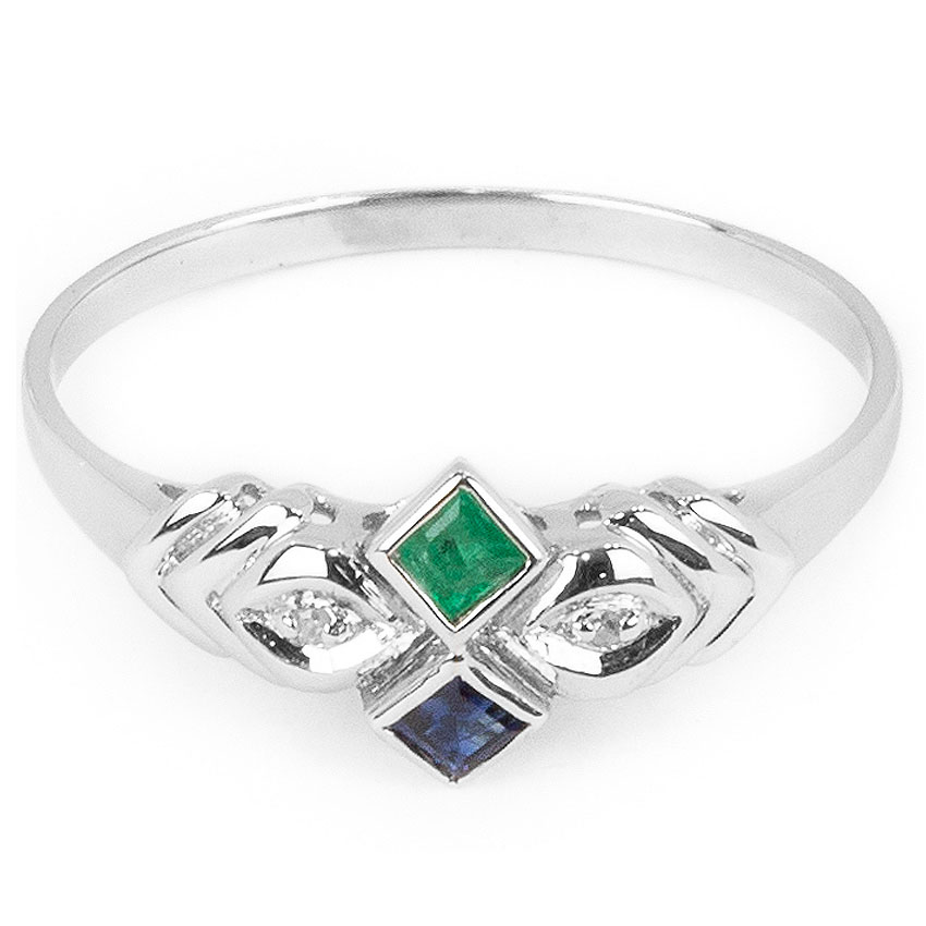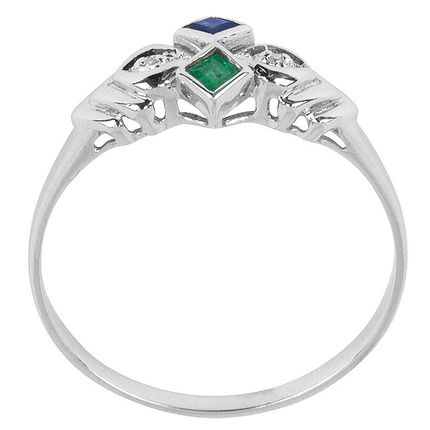 Una de nuestras piezas favoritas. Anillo fino fabricado en oro blanco 14K, con zafiro, esmeralda, y diamante natural. Pieza única.