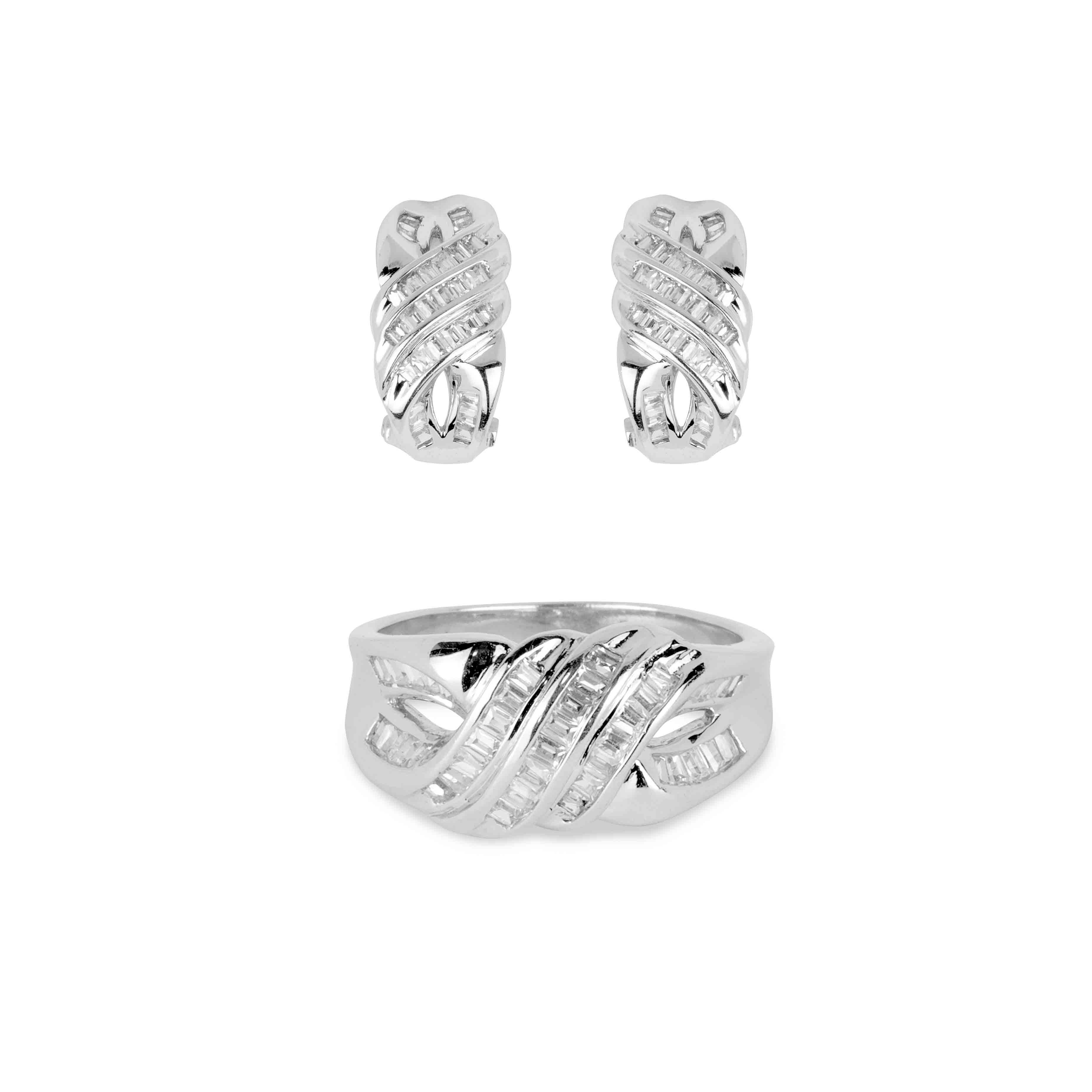 Juego de joyería fina fabricado en oro blanco 14K. Diamantes de forma baguette, con suma total de 0.50 ct. Pieza única.