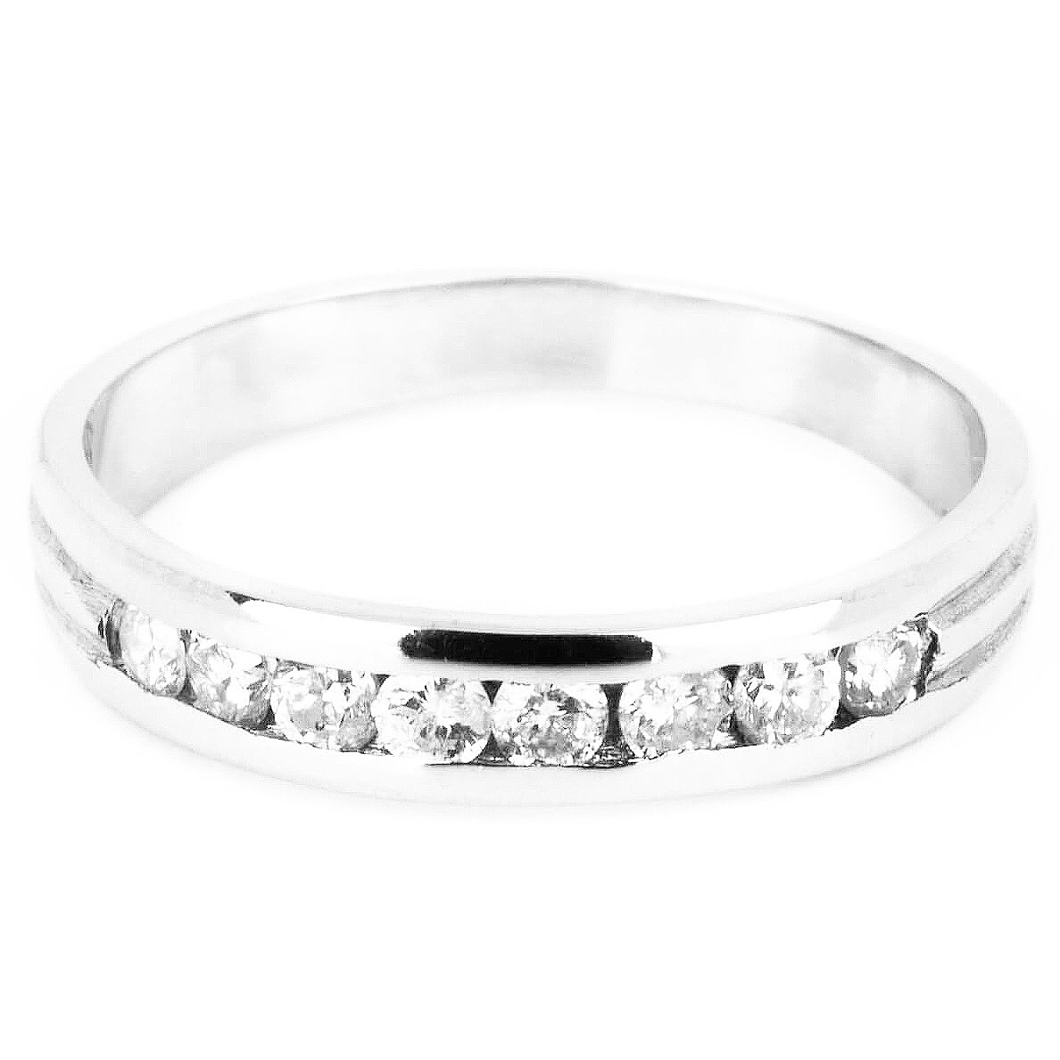Alianza para dama estilo canal con dos finas franjas por en medio. Ocho diamantes corte redondo montados a canal (0.24 ct total). Disponible en oro blanco y amarillo 14K.