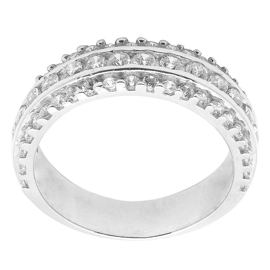 Radiante alianza de matrimonio para novia, con 0.75 ct diamante montados a pavé en tres franjas. Disponible en oro blanco, rosa y amarillo 14K.