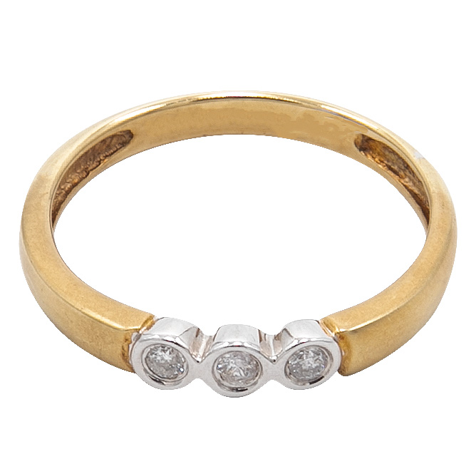 Anillo con tres diamantes redondos brillantes 0.04 CT c/u, montados a bezel. Anillo listo para entrega.