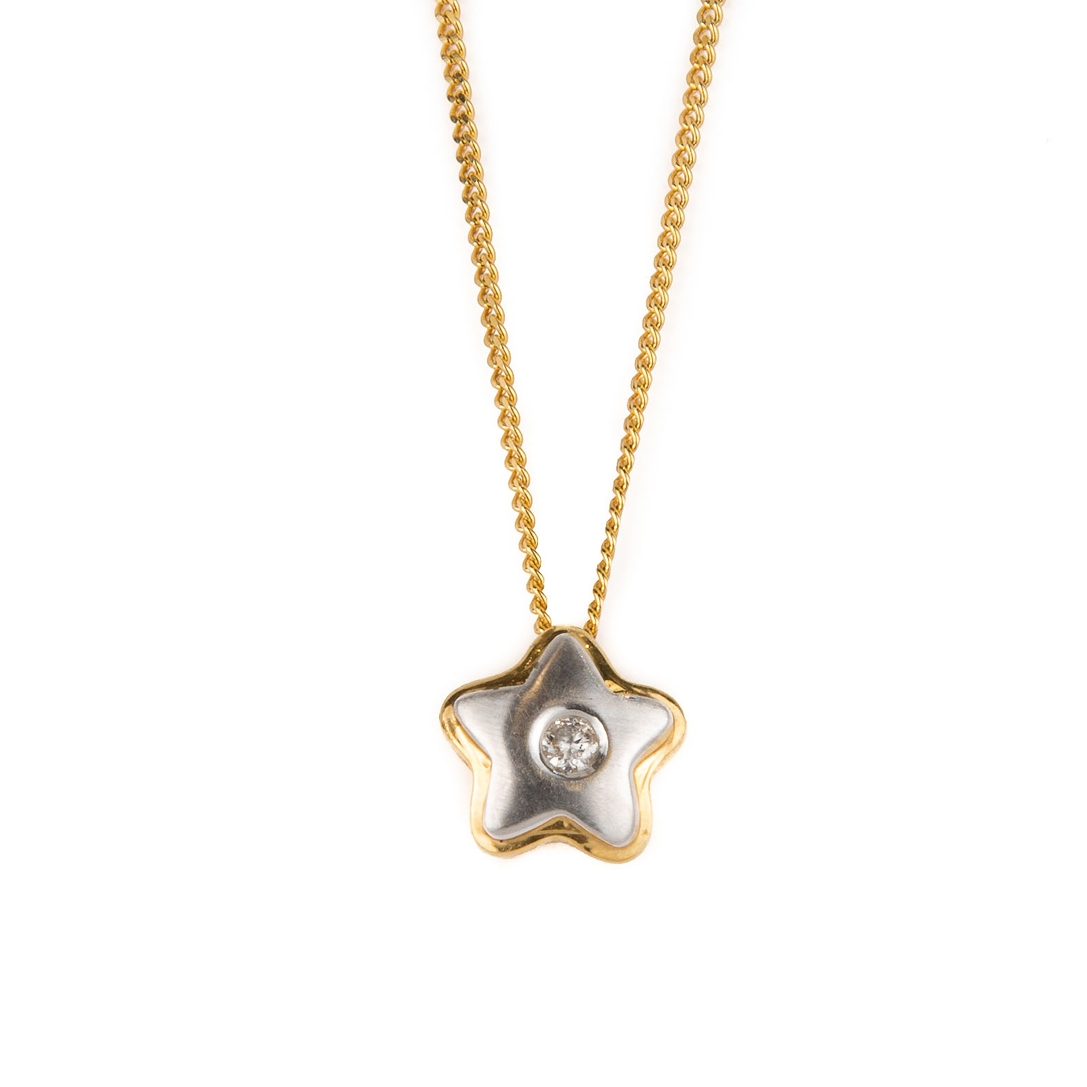 Gargantilla fina fabricada en oro combinado 14K (Oro blanco y oro amarillo), con .05 ct de diamante natural. Pieza única.