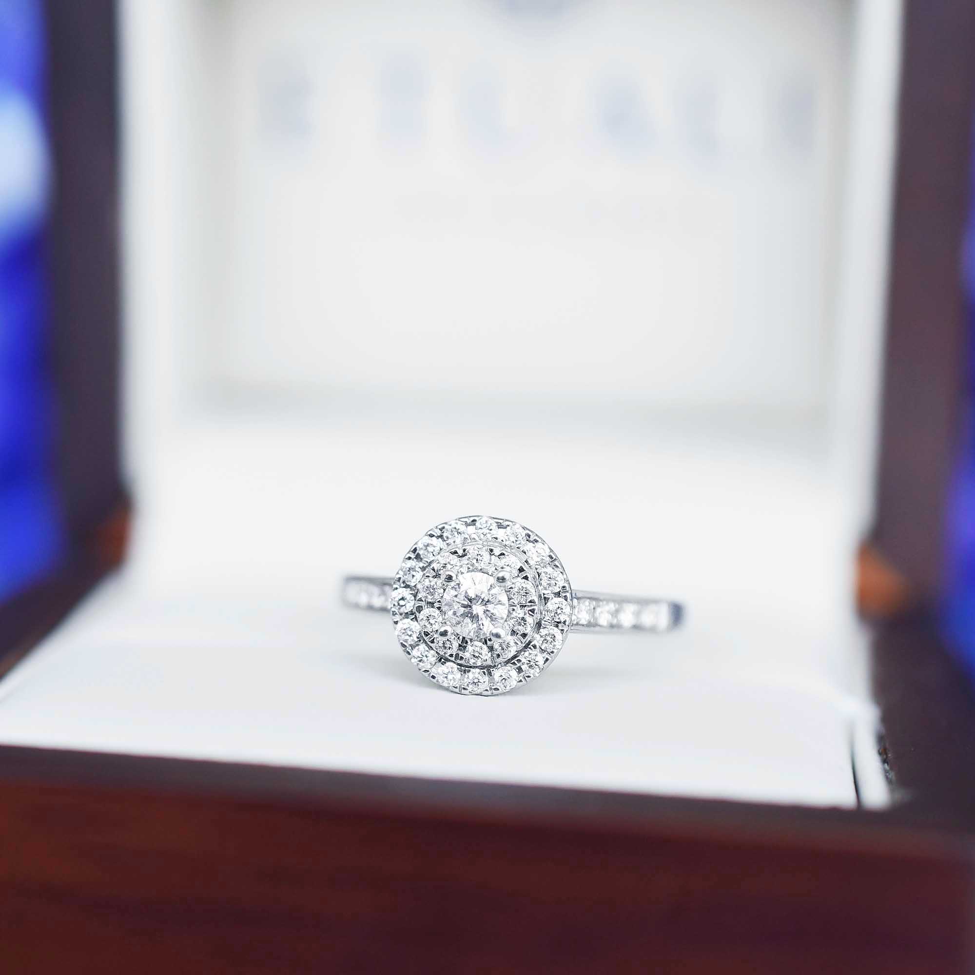 Es muy interesante el proceso de crear un anillo con doble halo, ya que es muy importante elegir bien la piedra central. Debe ser de un tamaño ideal, para que al hacer doble halo, pueda lucir el anillo. El diamante central también debe tener buen color, ya que si traer algún tono amarillo, se delata fácilmente con los diamantes que van alrededor. Todo el montado de los diamantes es a mano por nuestro joyero.