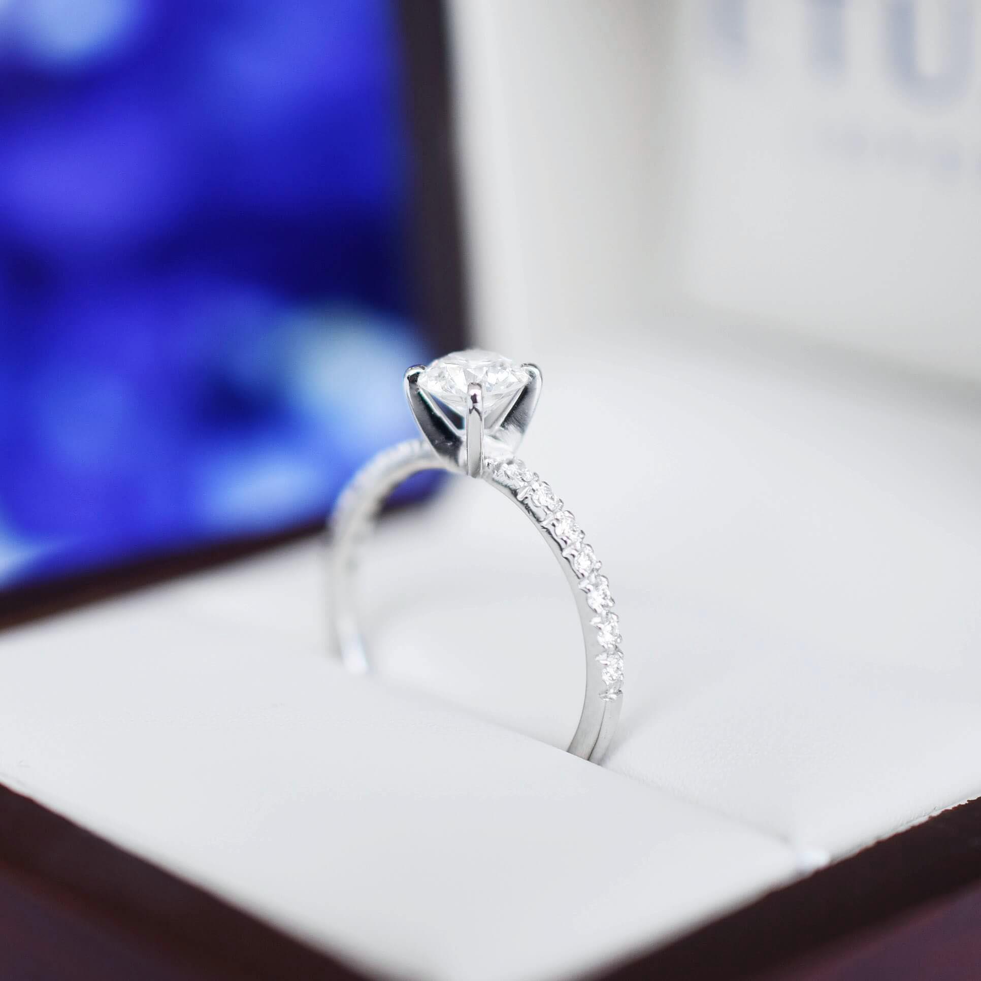 Esteban se acercó con nosotros para la fabricación de anillo de compromiso de su ahora prometida, Nina. Elegió un diamante central redondo brillante de 0.60 ct, y una montura con diamantes laterales montados a micropavé. Precio de montura desde $14,450 mxn. El diamante central se vende por separado.