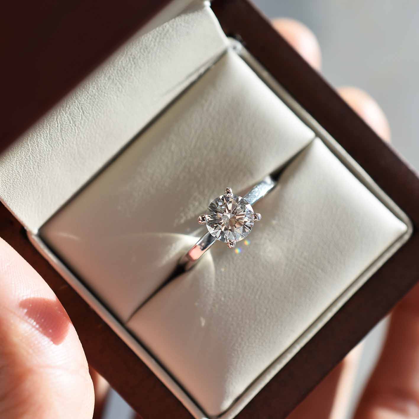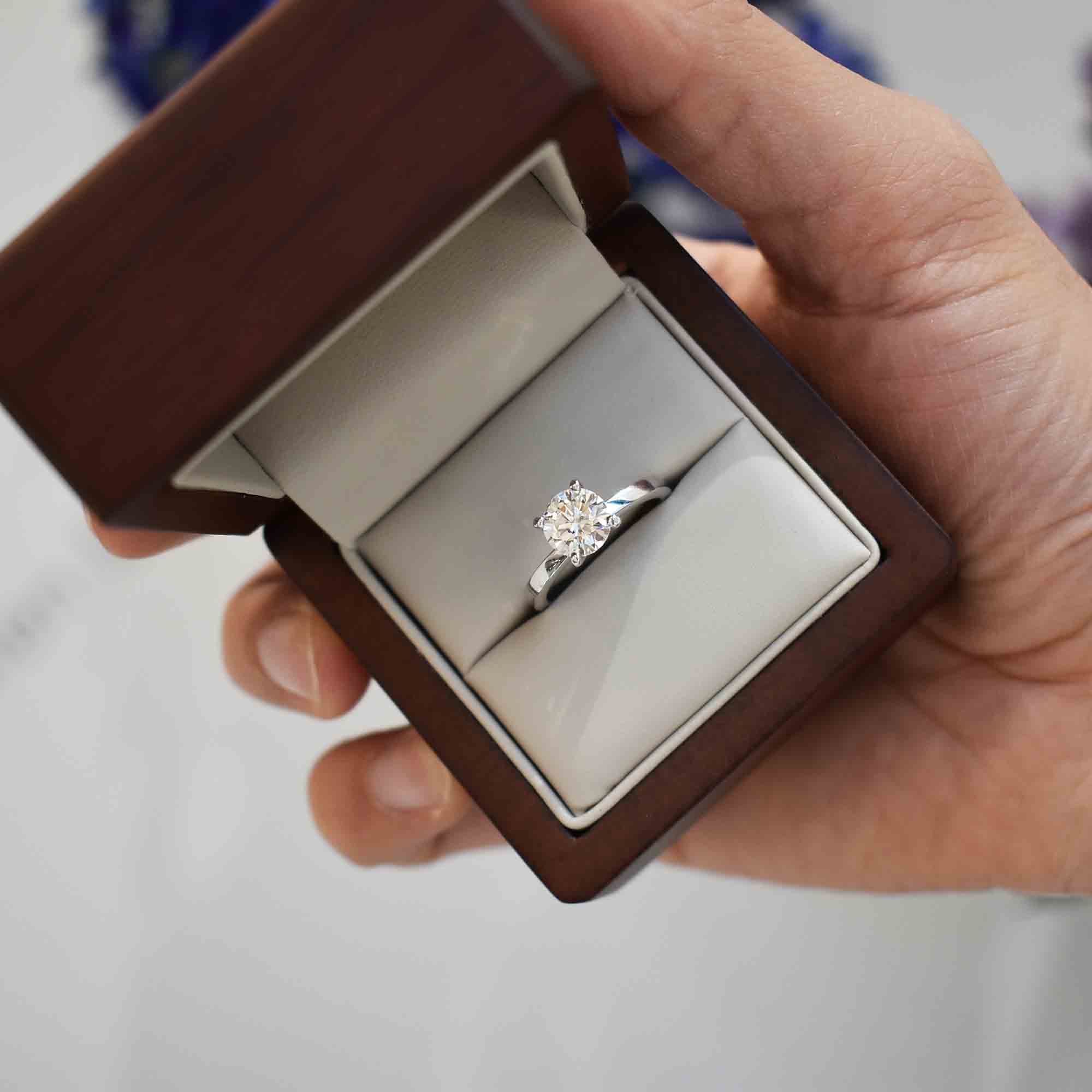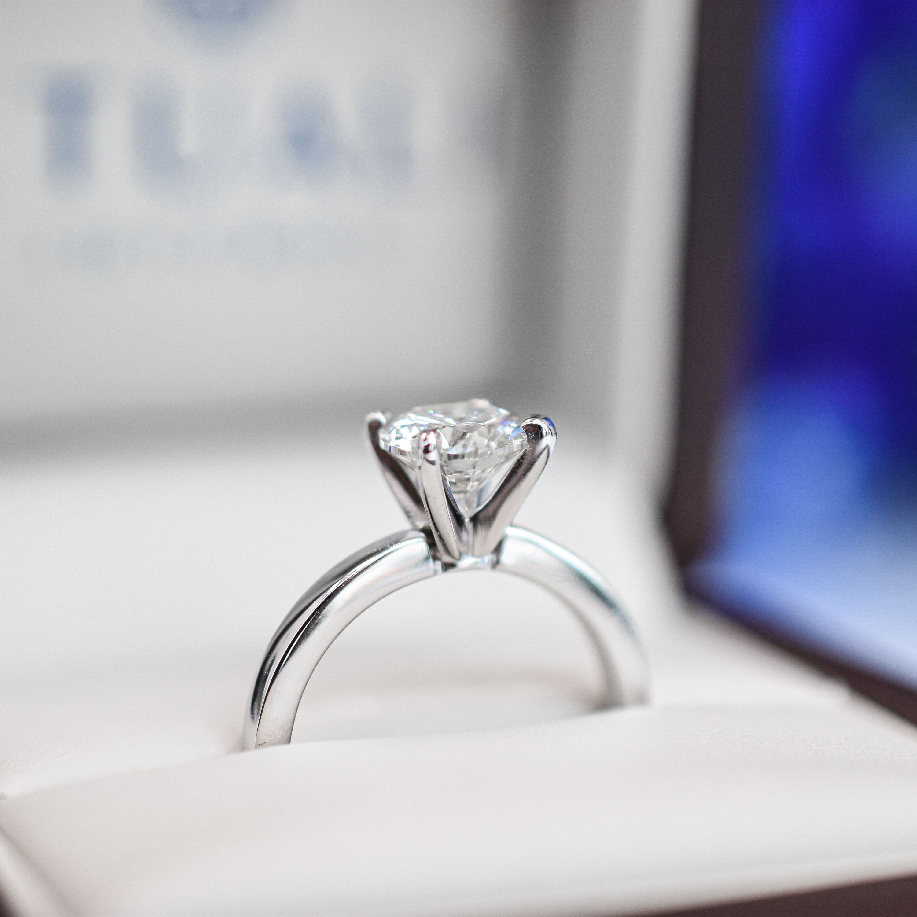 Chuy se acercó con nosotros para fabricar el anillo de compromiso de su ahora prometida, Meli. Originalmente tenía en mente un diamante redondo brillante con un carat entre 1 a 1.2, pero en cuanto vio esta opción se quedó enamorado. Elegimos un diamante de 1.5 ct como piedra central, y una montura estilo solitario clásico, con borde plano. La pieza se fabricó en oro blanco 14K.