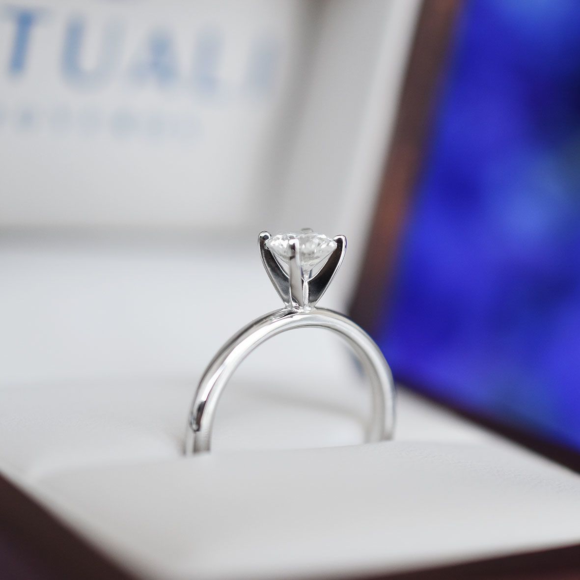 Para Paulina, fabricamos un solitario de 1.8 mm de grosor en oro blanco 14K. A diferencia de otros solitarios, el novio optó por elegir uno que tuviera las uñas de la montura un poco más elevadas. Así, al momento de agregar la alianza de matrimonio, hace un match perfecto con el anillo de compromiso. El diamante central es redondo brillante de 0.70 CT.