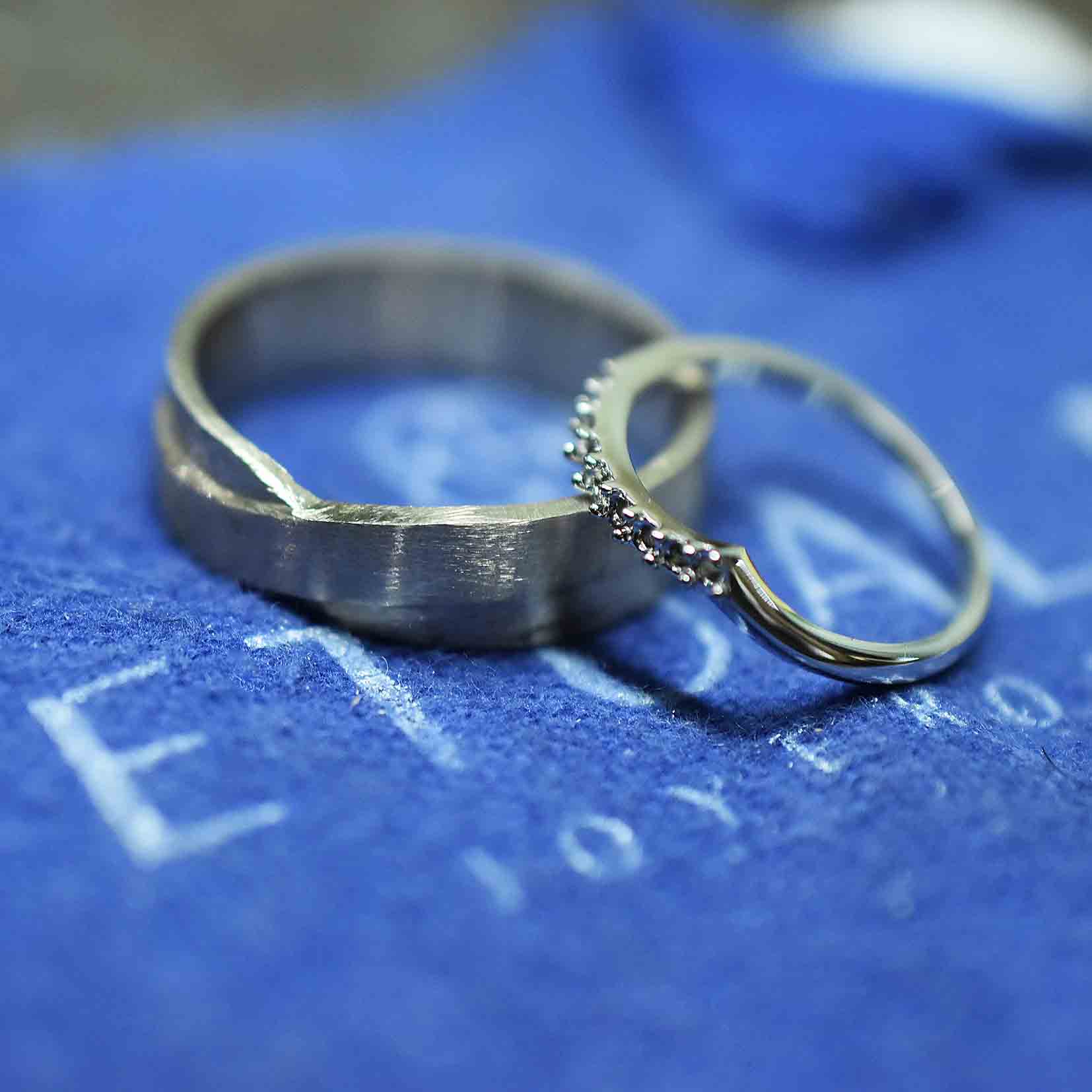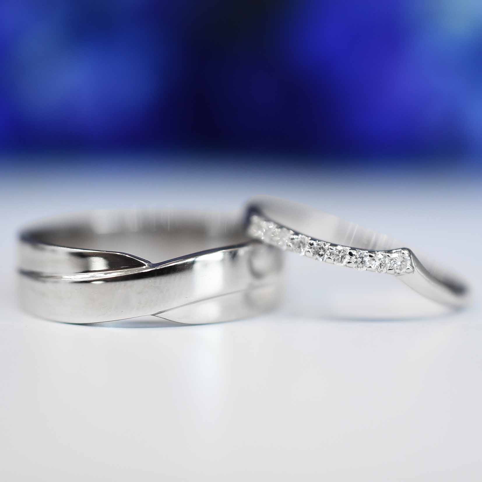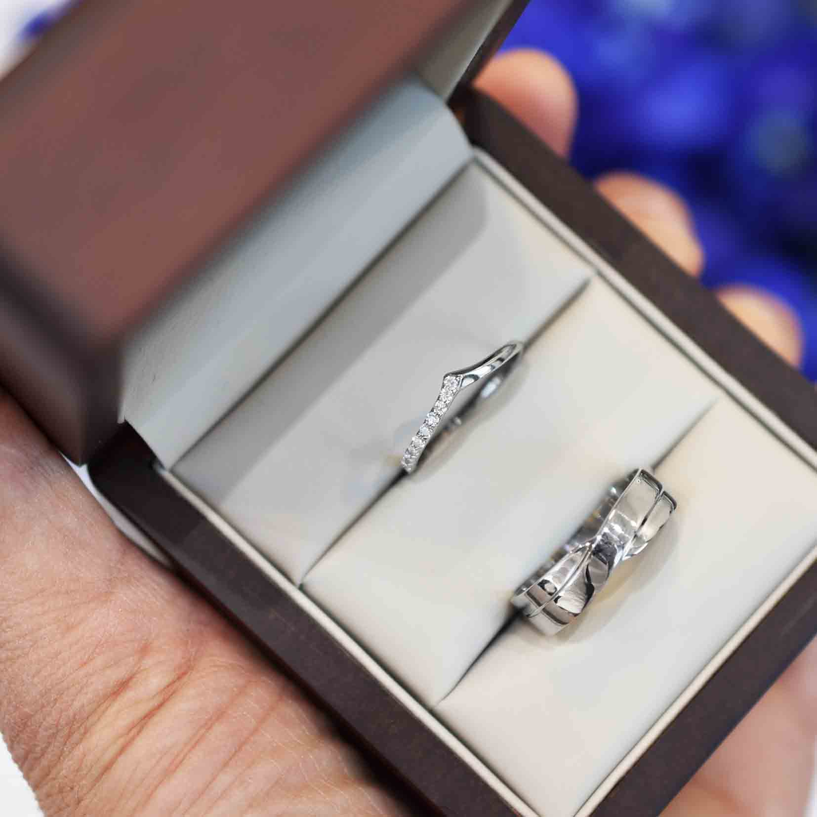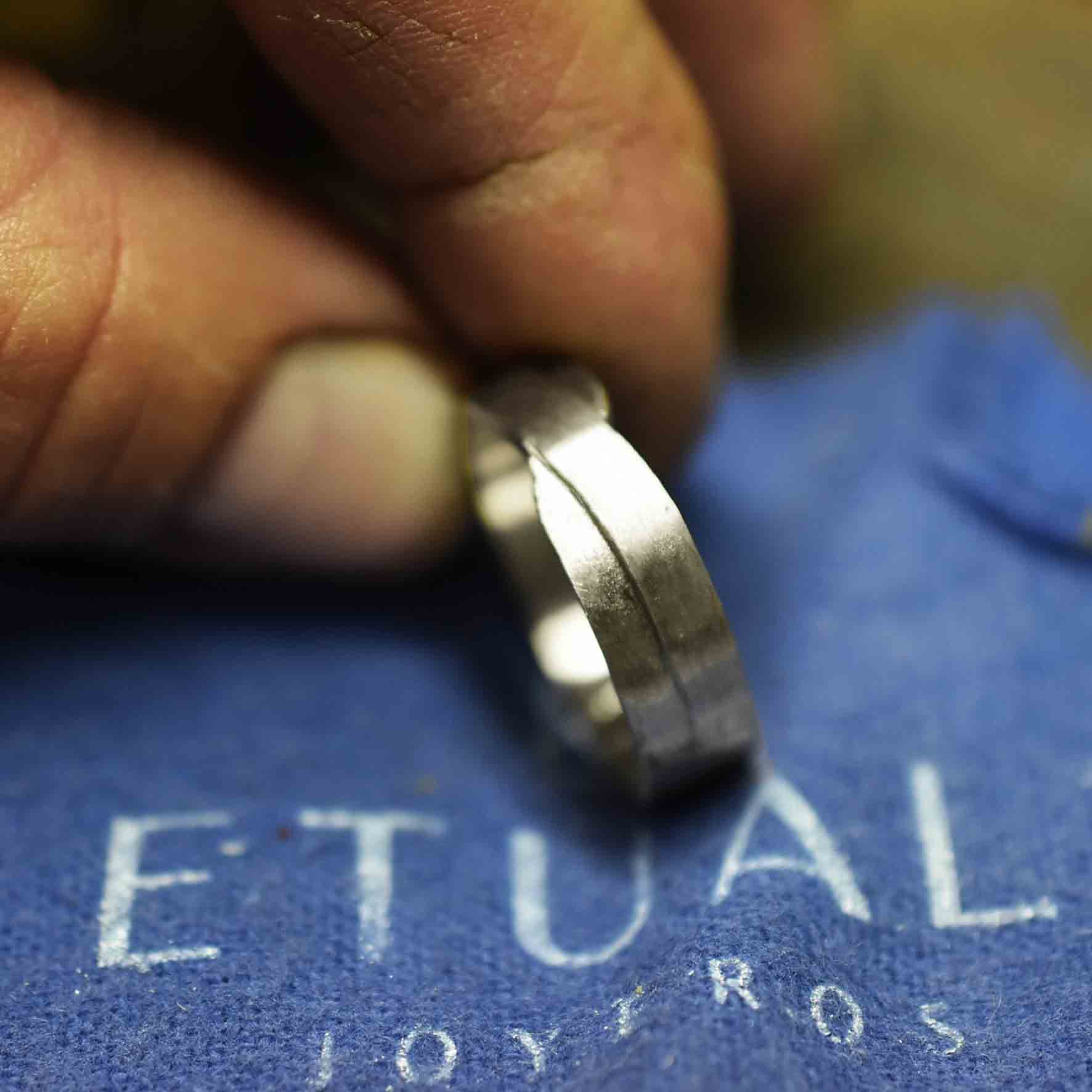 Anteriormente Gerardo nos había buscado para fabricar el anillo de compromiso de su ahora esposa, Cinthya. En su visita, revisamos las diferentes opciones para fabricar, y decidieron fabricar algo único y diferente. Para él, una alianza cruzada, y para ella, alianza estilo V, con 0.13 ct de diamante natural. Ambas piezas fueron fabricadas a mano, en oro blanco 14K.