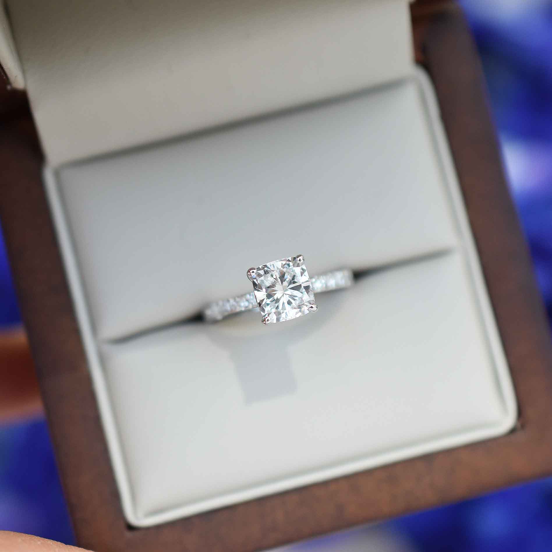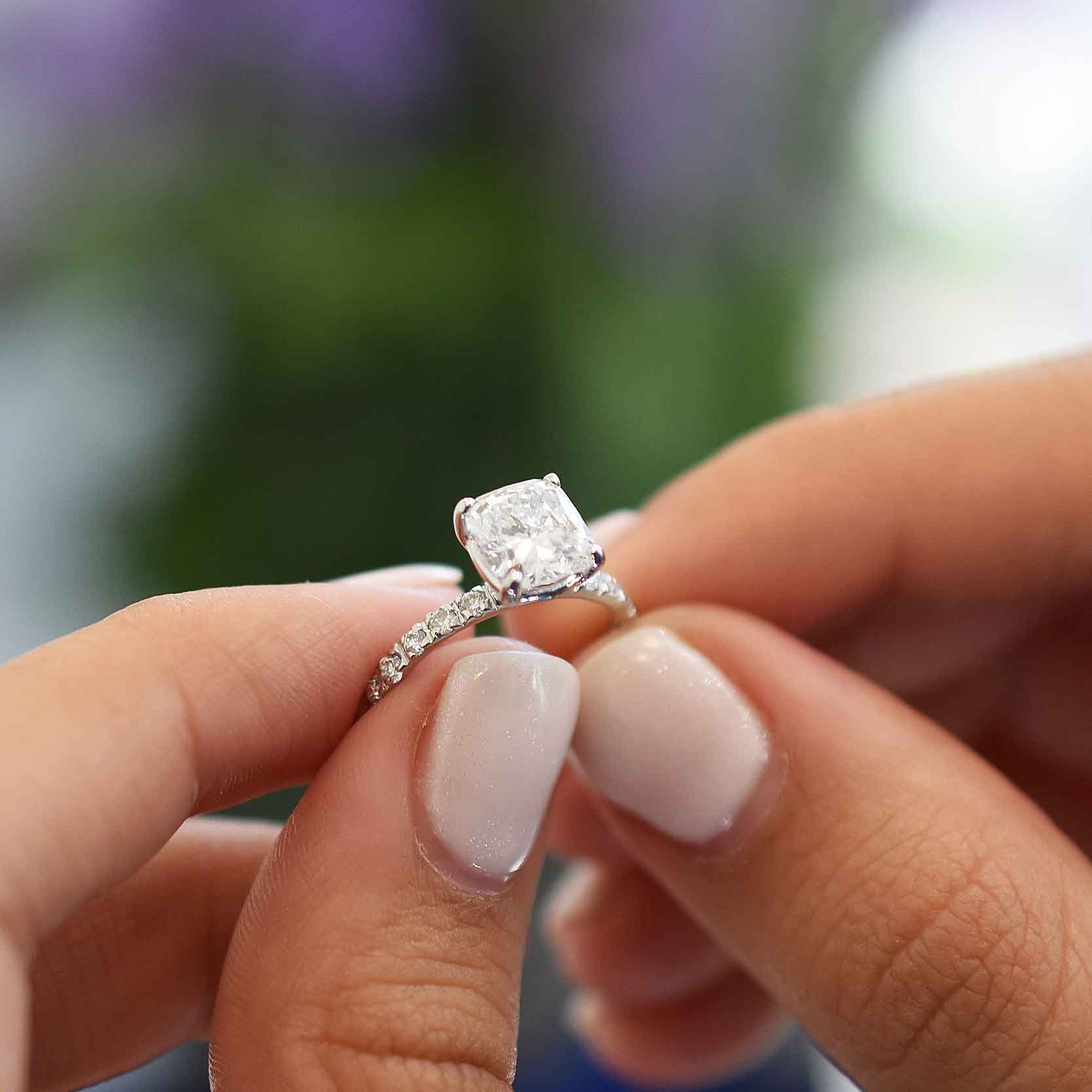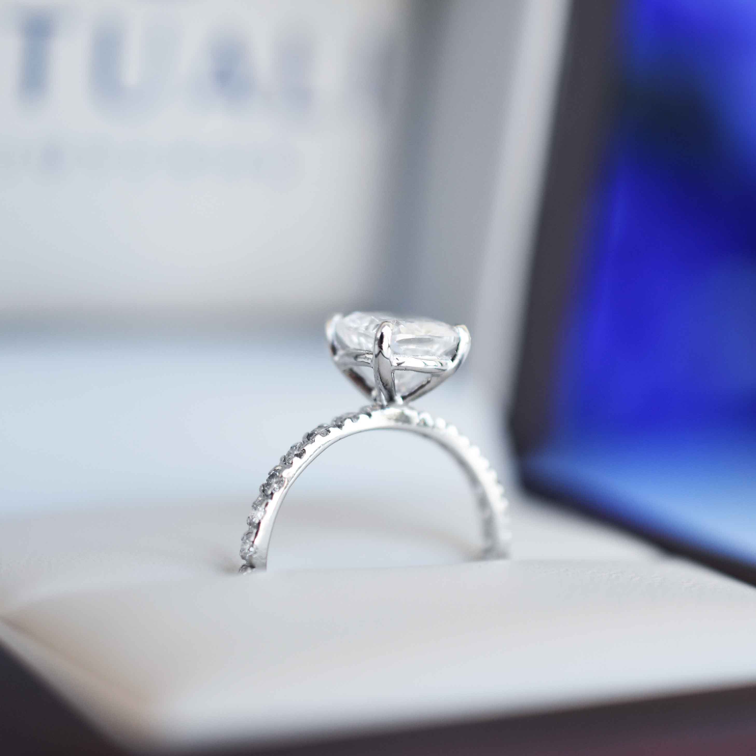 Nos fascinó fabricar esta pieza para Gaby. Su novio llegó con una idea muy clara de lo que buscaba, ya que sabía perfectamente el gusto de su novia. Lo primero que definimos fue el diamante: se eligió una forma estilo cojín de 1.30 quilates. Posteriormente elegimos la montura. Estábamos entre una opción de anillo solitario, o bien el anillo montado a pavé. Fue esta segunda opción la que se eligió, y el resultado nos pareció bastante lindo. Al montar un diamante cojín, es importante hacerlo en este tipo de montura, que proteja lo suficiente a la piedra.