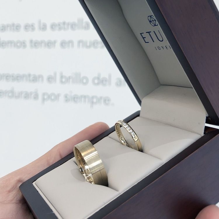 Eva & Thomas llegaron buscando su par de alianzas que fueran en el mismo metal (oro amarillo 14K) pero que ambas lucieran diferentes. Para ella, fabricamos su alianza estilo canal con 0.19 ct de diamante natural, que hace juego con su anillo solitario. Para Thomas, realizamos su pieza en terminado mate de 6 mm.