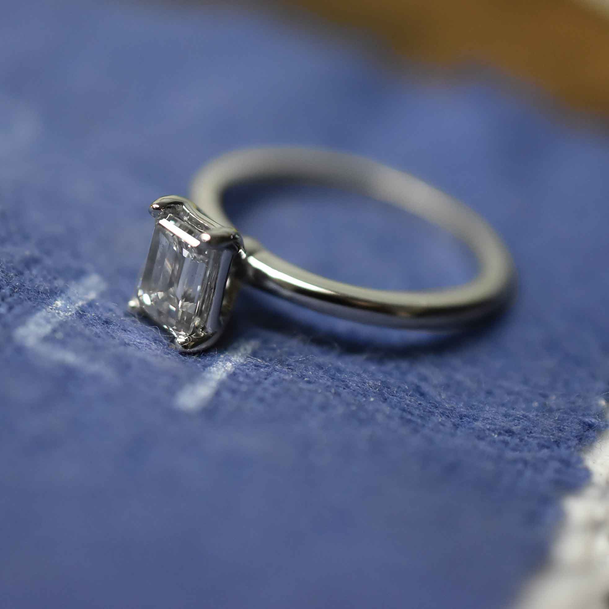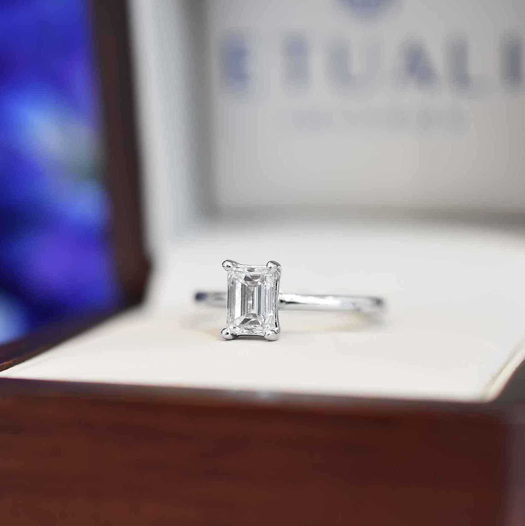 El novio se acercó buscando un anillo con el diamante en forma cuadrada. Después de revisar las diferentes propuestas (Corte radiante, princesa, asscher...) elegimos la opción de diamante con forma esmeralda, que tiene un corte bastante elegante y minimalista. La montura fue un estilo clásico de 1.5 mm de grosor, con una canasta sujetando a la piedra central. Un #EtualiTip que siempre recomendamos a nuestros novios en cuanto a la elección de un diamante esmeralda es que es muy importante elegir uno con excelente color y pureza.
