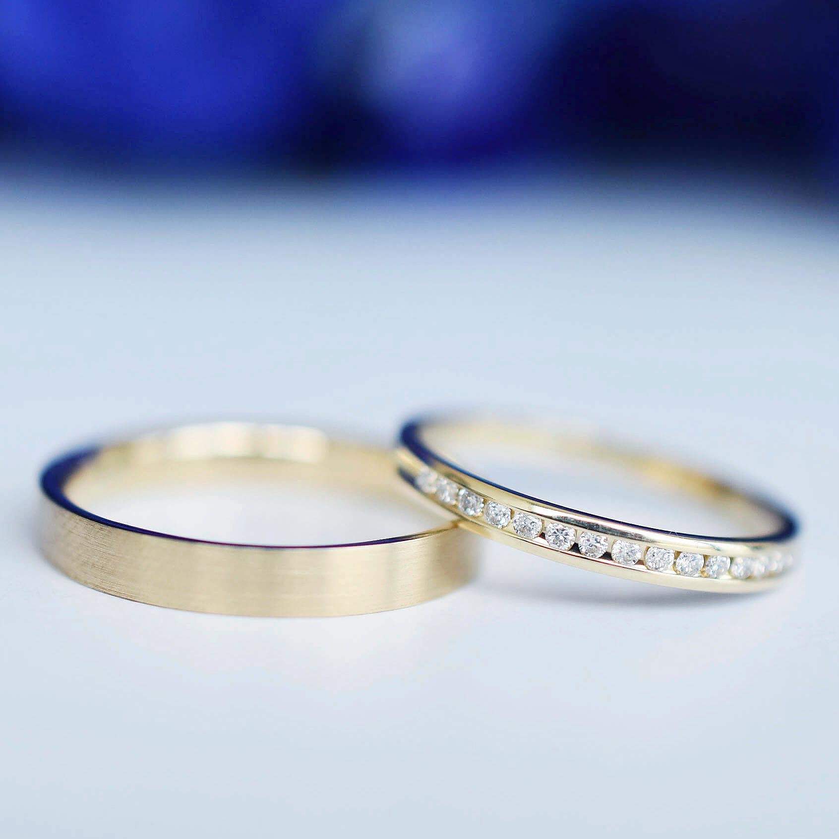 Nos encantó esta combinación que se fabricó para Amy & Karen. Amy eligió una alianza de matrimonio con 0.10 CT de diamante natural montados a canal, y Karen, una alianza lisa terminado mate. Ambas piezas se fabricaron en oro amarillo 14K.