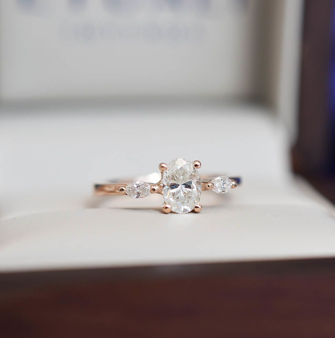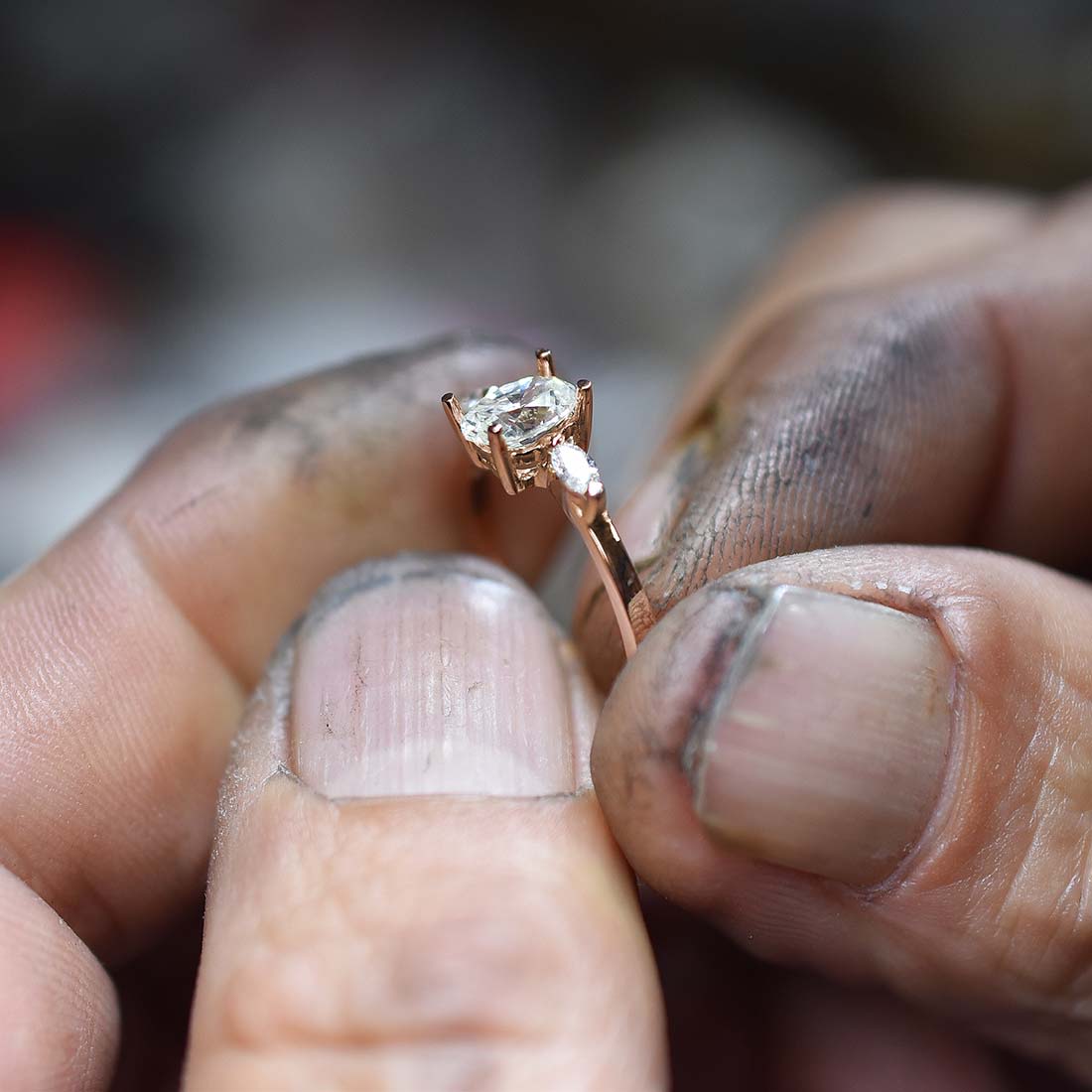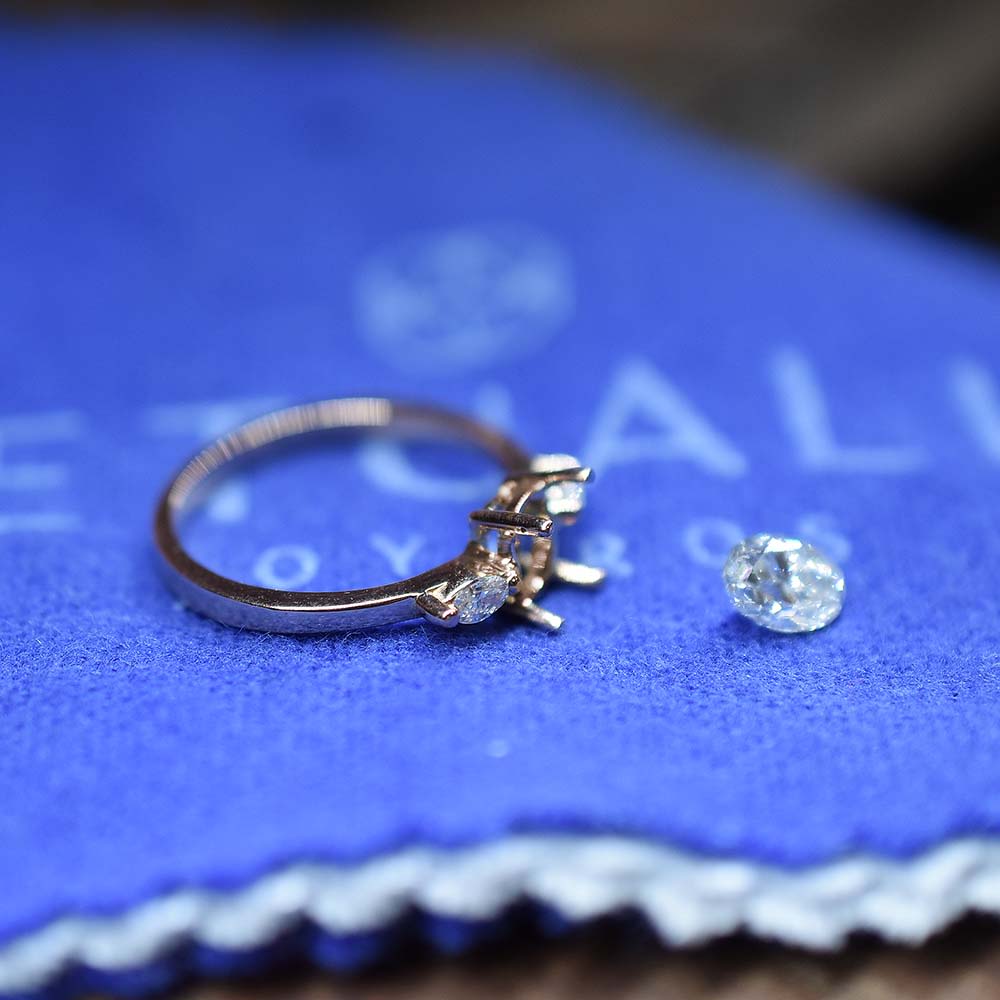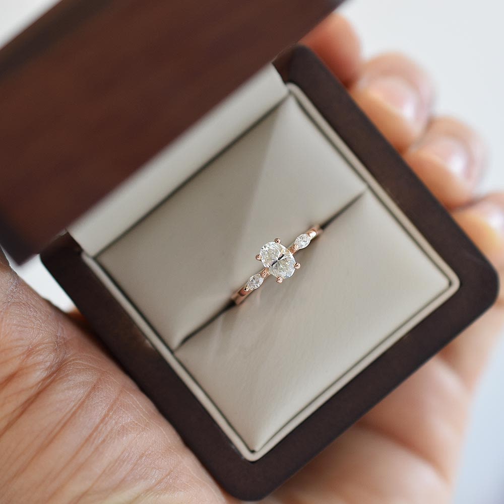 Nos encantó el diseño que Eugenio decidió fabricar para su ahora prometida, Sylvia. Optó por un anillo de compromiso con diamante óvalo, y diamantes laterales con forma marquesa. Al agregar las piedras laterales, le da un look sofisticado y diferente a la pieza. El anillo se fabricó en oro rosa 14K.
