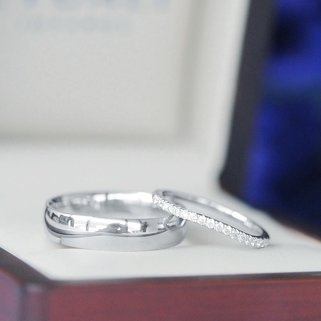 Se fabricó una churumbela pavé ligeramente ondulada para Ana, para que pudiera embonar perfectamente con su anillo de compromiso. Para Arturo, se eligió una alianza sencilla media caña.