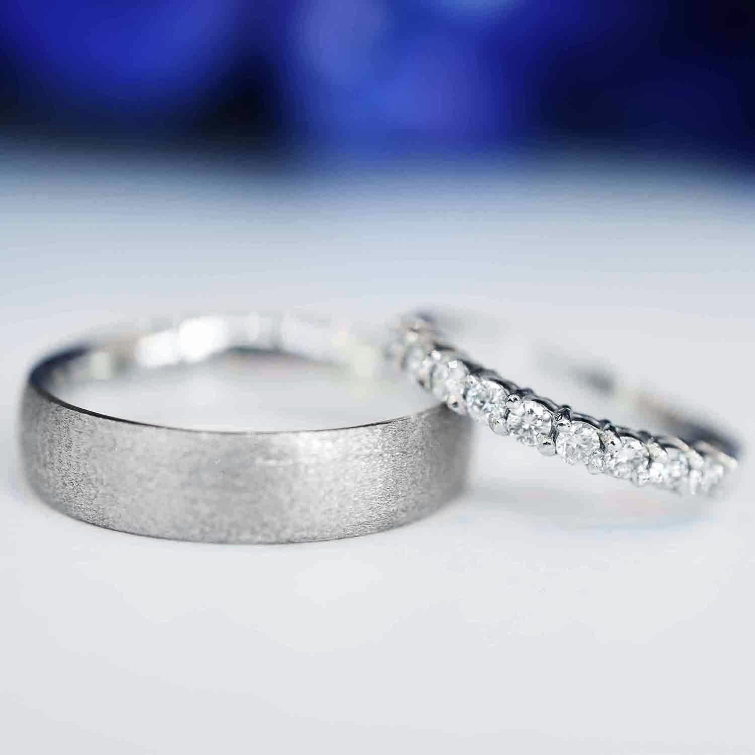 Para Elizabeth, fabricamos su alianza de matrimonio con 0.30 ct de diamante natural, con uñas compartidas. Para Héctor, su alianza en oro blanco 14K, con terminado mate esmerilado. Una combinación que nos encantó.