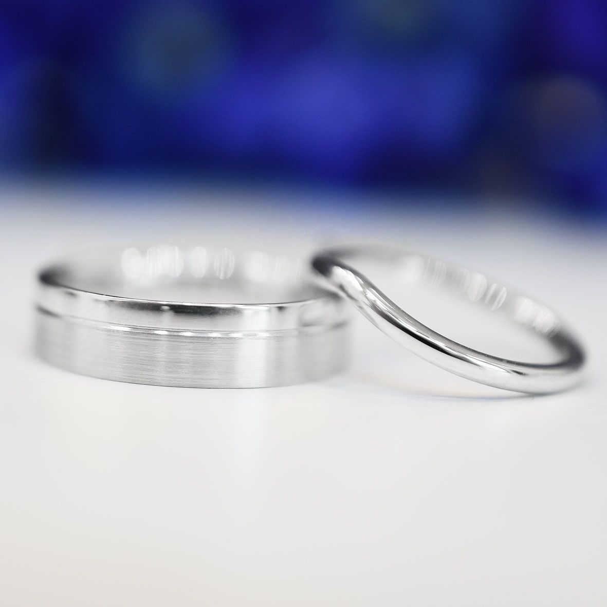 Elizabeth y Julián eligieron este par de alianzas, que mandamos fabricar para ellos. Nos compartieron la idea que tenían en mente, y se las pudimos elaborar en nuestro taller. Para Elizabeth, una alianza con 2 mm de grosor, y una ligera curva para que pudiera embonar con su anillo de compromiso pavé. Para Julián, una alianza plana con terminado mate y una franja lisa. Ambas piezas se fabricaron en oro blanco 14K.